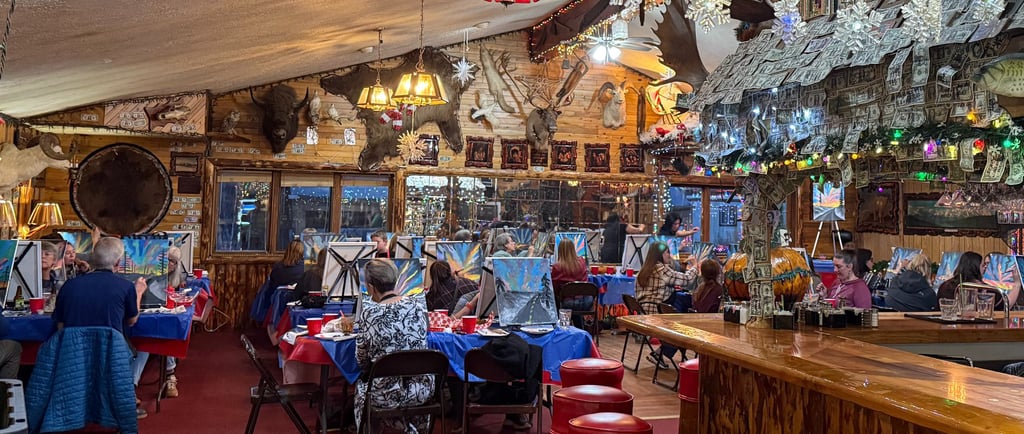 Chatanika Lodge was ecstatic to welcome over 40 guests in tonight's first paint night under new ownership. Cheri was glad to help kick off a new suite of events the lodge is looking to put on for the community. This night had Cheri from AK Art & Soul guide guests in painting the aurora over an empty, backwoods road. Each unique painting features lovely detail of the lights overhead as well as the tree cover on the side of the road. Guests had the opportunity to eat, drink, and socialize while creating their own masterpieces. A fun night out for those able to make it, and a special piece of art to remember it always. There is already scheduled another paint night on an undetermined night next month. Don't wait around to read about it next time. Make sure to book your spot today!